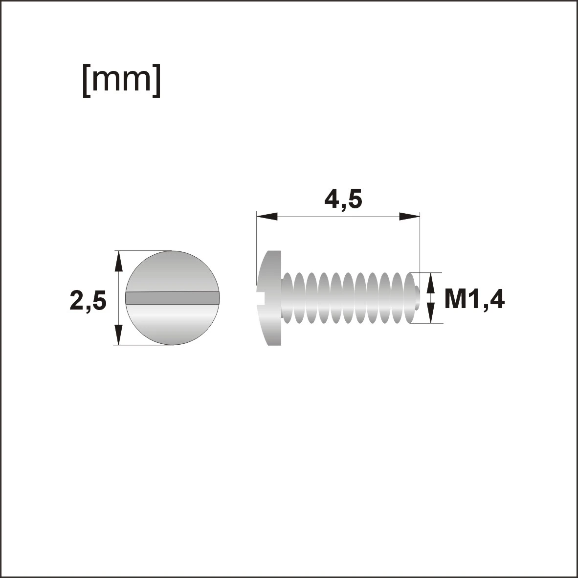 Śrubka do opraw okularowych M1,4 × 4,5 mm z główką pod wkrętak płaski, pełny gwint, wykończenie srebrne; opakowanie 100 sztuk.