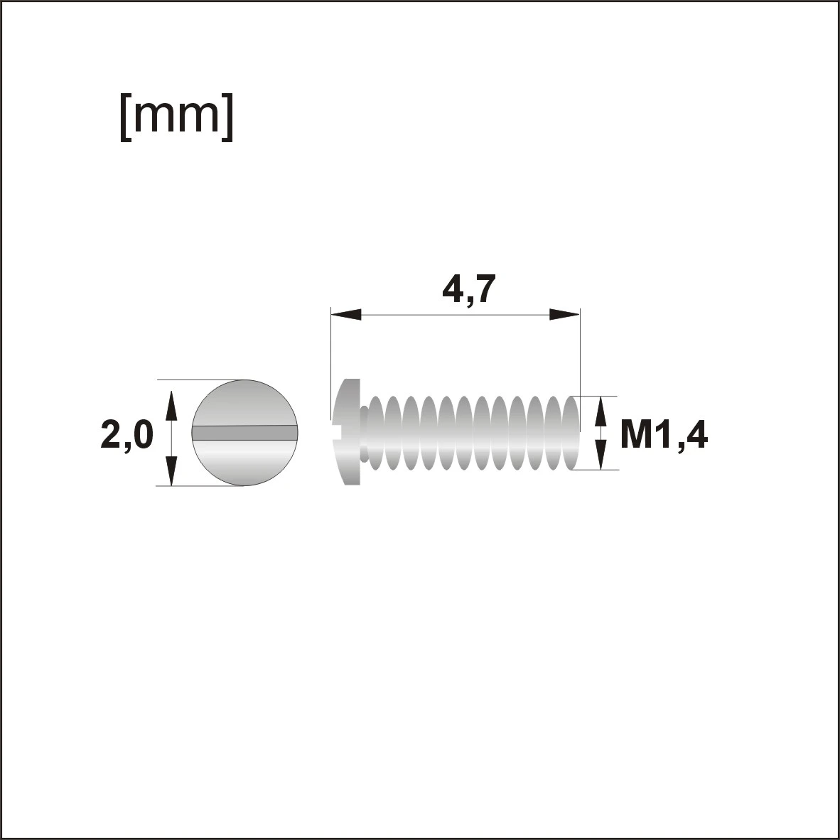 Śrubka do opraw okularowych M1,4 × 4,7 mm z główką pod wkrętak płaski, pełny gwint, wykończenie srebrne; opakowanie 100 sztuk.